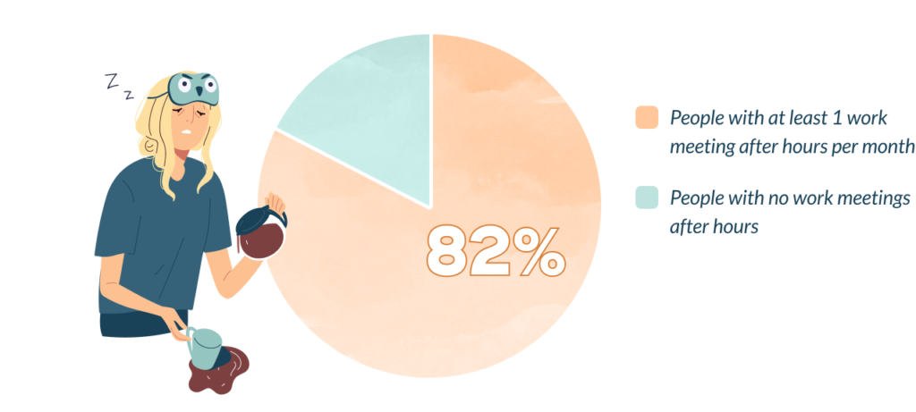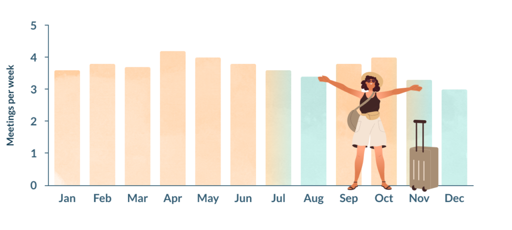 The most striking revelation is the disappearance of standard working hours: the “9-to-5” workday is largely a relic of the past for knowledge workers. Our data reveals that over 80% of people now attend at least one after-hours work meeting every month. This shift points to a more flexible, asynchronous reality where global teams and flexible schedules blur the lines between “work time” and “personal time.” Maybe that’s not a bad thing per se, but it’s something to be aware of when keeping an eye out for signs of burnout in ourselves and others. Everyone needs a break at some point, whether that’s a stricter daily working hours policy or a culture that encourages using vacation time.